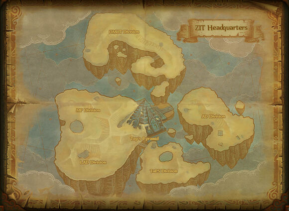 ZIT Hearquarters consist of five divisions on four separate allods with big Pyramid in the centre. Zone is accesible by teleportation scroll and then by portal near the Pyramid.